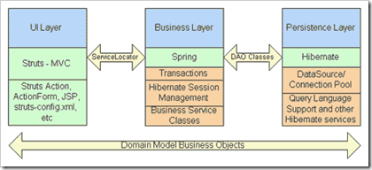 三层架构:表示层、业务层、持久层。即Struts2+Spring2+Hibernate3。